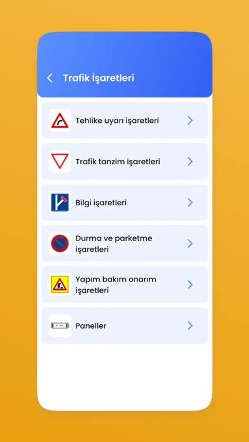 • İlgili tüm ulusal yol işaretlerinin tam listesi.