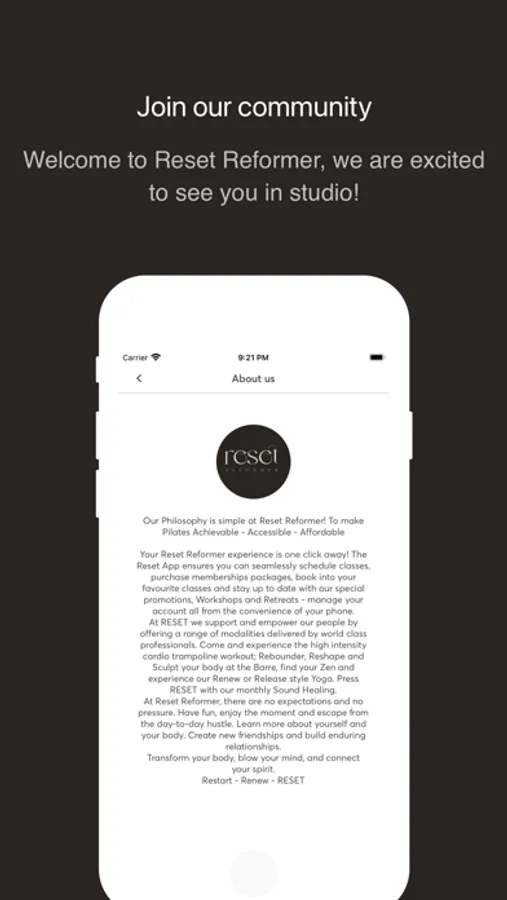 Your Reset Reformer experience is one click away! The Reset App ensures you seamlessly schedule classes, purchase memberships packages, book into your favourite classes and stay up to date with our special promotions, Workshops and Retreats - manage your account all from the convenience of your phone.