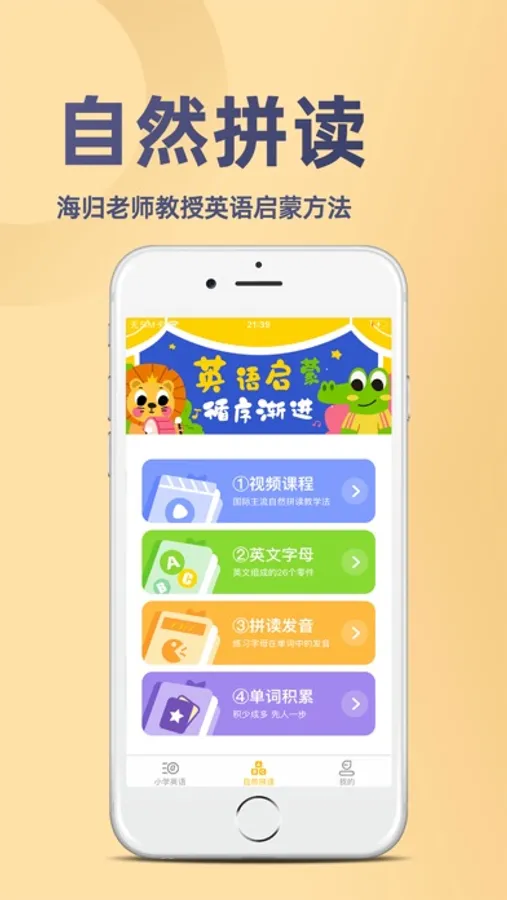目前小学英语一年级即开始教授Phonics自然拼读学习法。Phonics自然拼读是目前国际上流行的儿童英语启蒙方法,0-6岁儿童英语启蒙必学课程。邀请海归老师结合多年教育经验,精心设计课程,用低廉的学费让中国孩子也可以享受优质的Phonics自然拼读教育资源。无需音标、无需死记硬背,从根本上了解英语发音逻辑,从小规范英语发音,像母语国家的儿童英语启蒙一样做到见词能读、听音能写。