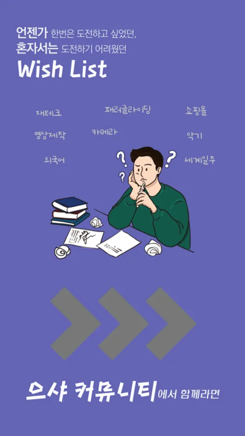 언젠가 꼭 도전하고 싶었던 Wish list, 함께라면 더욱 쉽게 도전하고 꾸준히 성취할 수 있어요! ‘으샤' 앱에서 다양한 관심사, 다양한 사람들을 만나보세요.