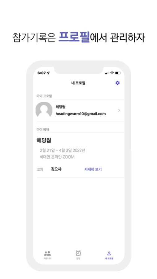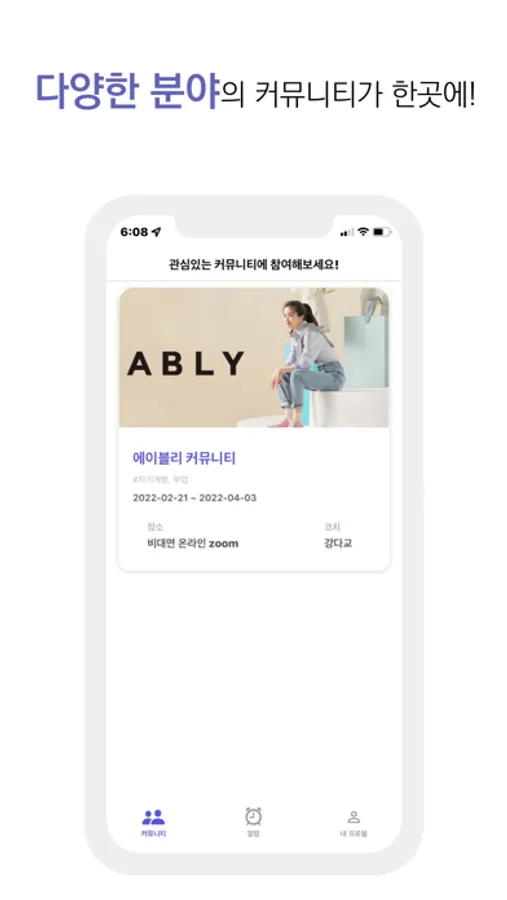 다양한 주제의 커뮤니티 리스트를 앱으로 살펴보세요. 모임 운영 기간, 장소, 코치 등 모임에 대한 정보를 확인할 수 있습니다.