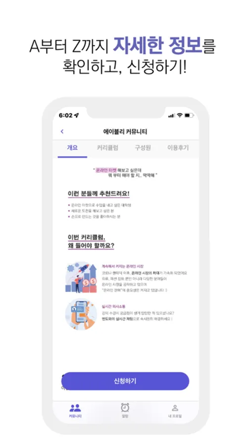 각 커뮤니티 별 개요, 커리큘럼, 코치, 함께하는 구성원 정보까지! 커뮤니티를 신청할 때 고려해야 할 정보들을 확인할 수 있어요. 으샤가 엄선한 코치님과 커리큘럼이니 믿고 참여해 보세요!