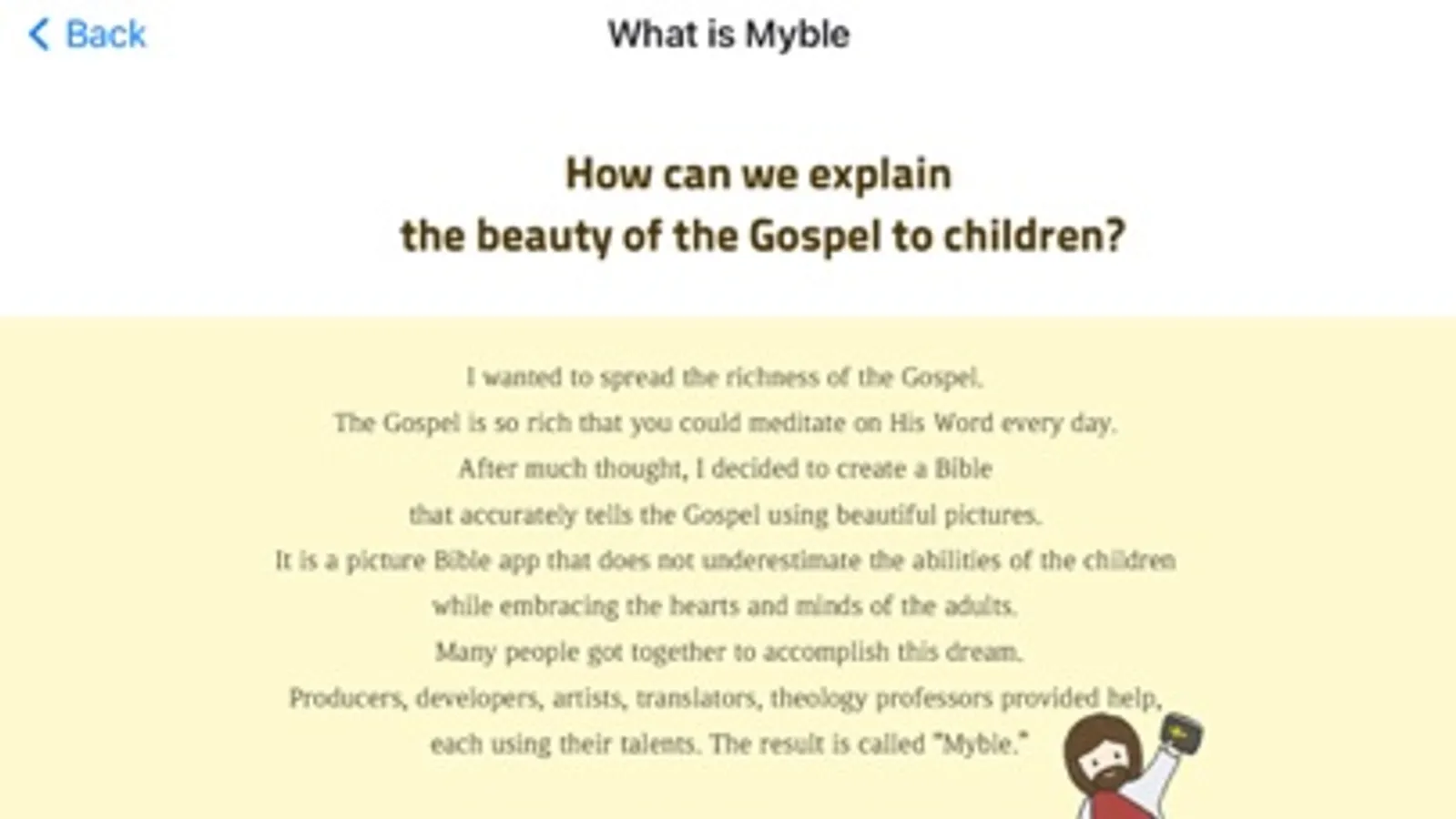1. Myble will provide at least Bible story every month that will consistently and uniformly tell the entire story of the Bible.