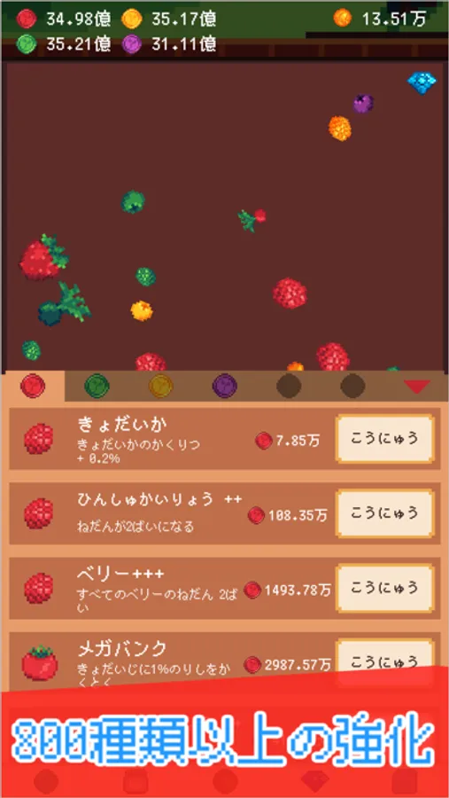 育成を進めると野菜をアップグレードできるようになります。アップグレードされた果物は様々な特殊効果を持っています!RPGやハクスラのように特殊な果物を集めましょう!