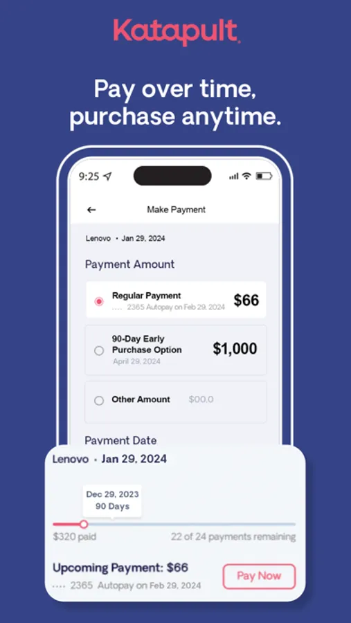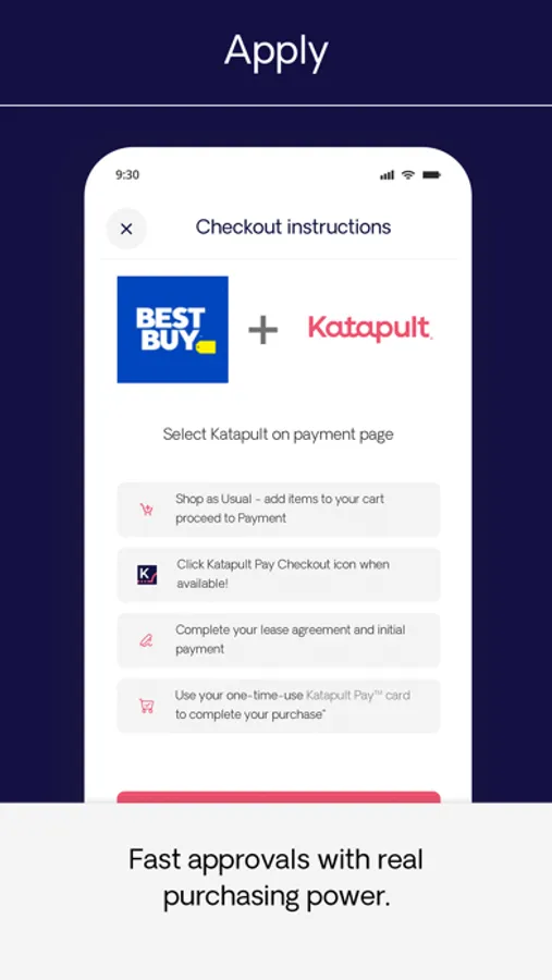 Select Katapult as the payment option in checkout. Start your lease-purchase application and once approved get the flexibility to pay over time, purchase early or even return your items. Katapult … a better way to pay.