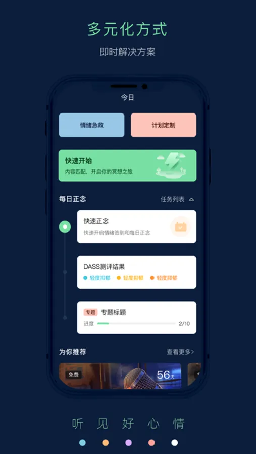 2.高品质原声冥想音乐:涵盖了冥想入门、专注自控、减少焦虑、环节情绪、放松解压、提升幸福和自信等多种类的冥想音频内容,从入门到进阶,满足用户的全场景冥想学习需求。