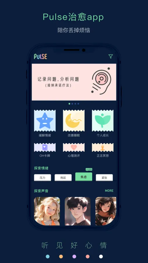 Pulse是一款专业的,有温度的心理健康疗愈管理软件。这里有丰富的冥想课程,有助于减轻压力,提升专注,实现深度的自我疗愈。更有众多人气声优在线,为用户打造多场景的解压、放松空间。Pulse愿意成为你栖息之所,在这里与你一起硬核面对世界,温和面对自己!帮助你获得健康的生活方式。