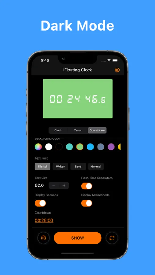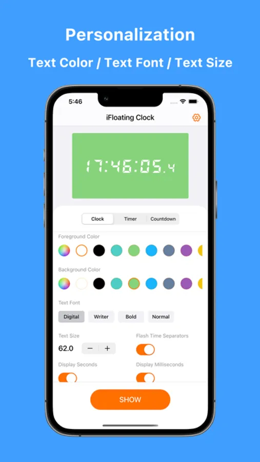- Allows free adjustment of the displayed time's text color, font, and size