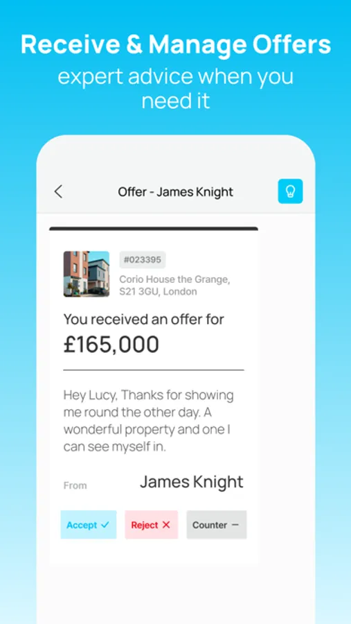 Once you're happy with an offer, you can accept it through the app. We'll then confirm the buyer's details and create the necessary legal documents to pass on to your instructed solicitor.