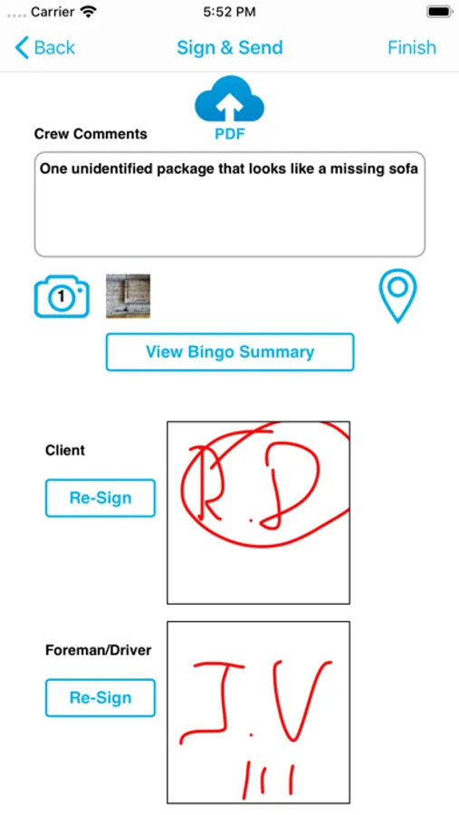 The app helps describe all damages with photos, capture unidentified packages, get client’s signature and share the final summary PDF with client, office and booking agent. Upon completion the PDF goes back to the Voxme system that dispatched the bingo.