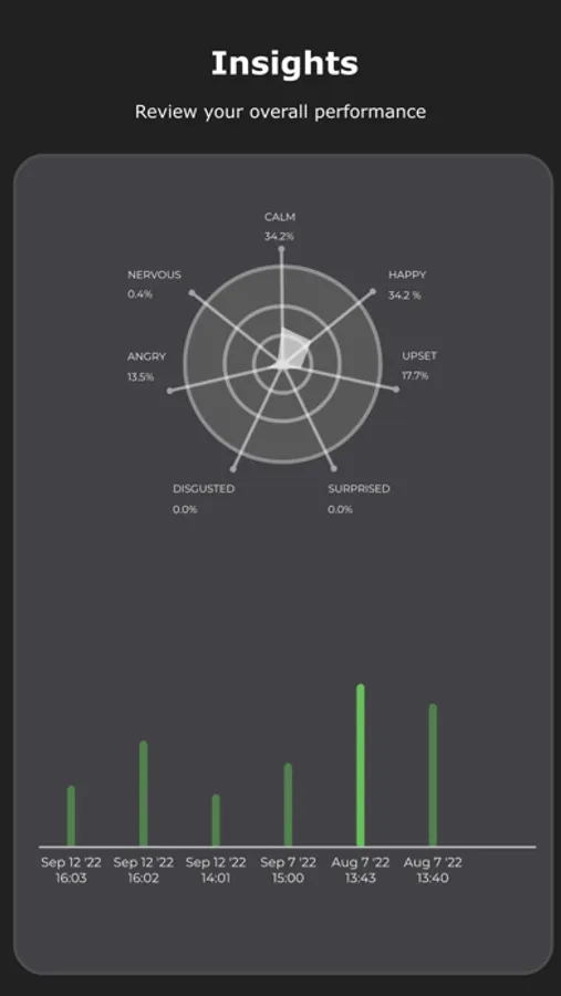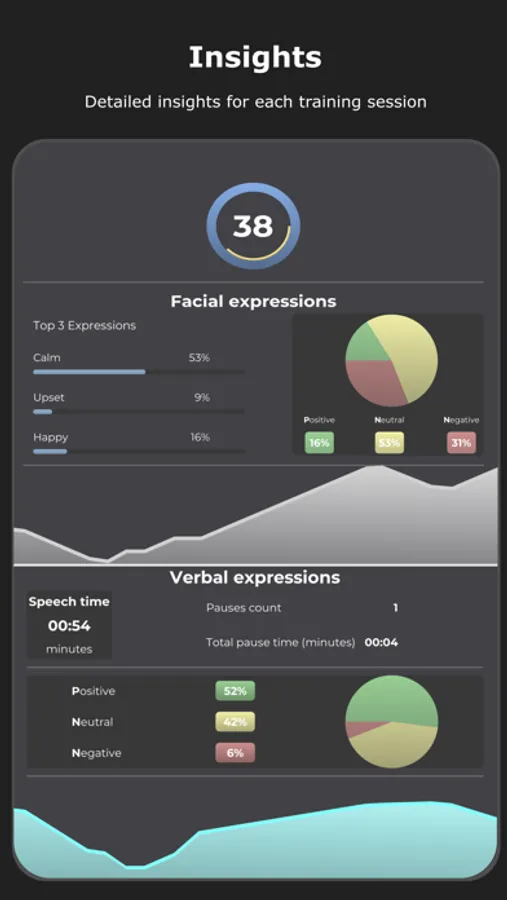 · Facial and verbal expressions analysis data is available as graphs and charts.
