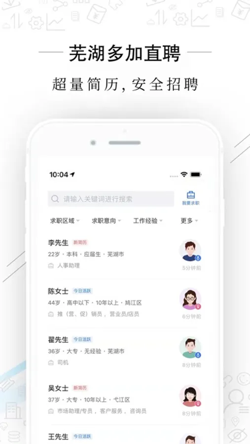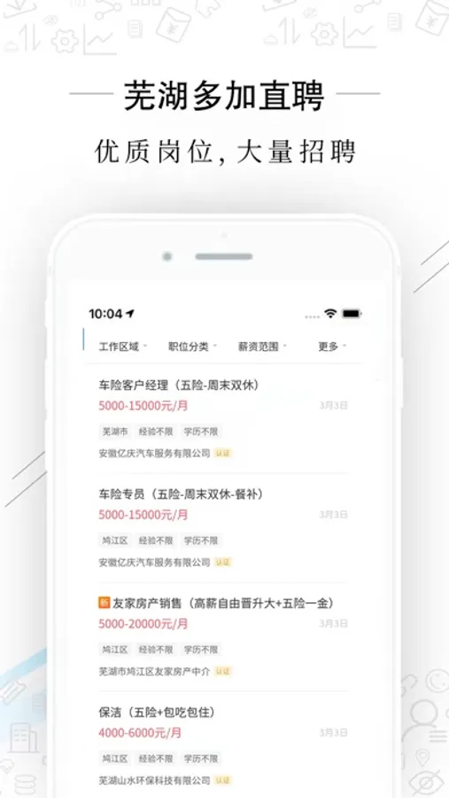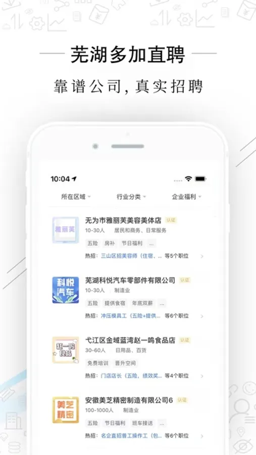 芜湖招聘,芜湖找工作,就看芜湖多加直聘!芜湖多加直聘是芜湖多加直聘网络科技有限公司旗下招聘网站,致力于为求职者提供芜湖本地优质招聘信息、为企业提供招聘渠道,帮助每一个求职者在芜湖多加直聘找到合适的工作!