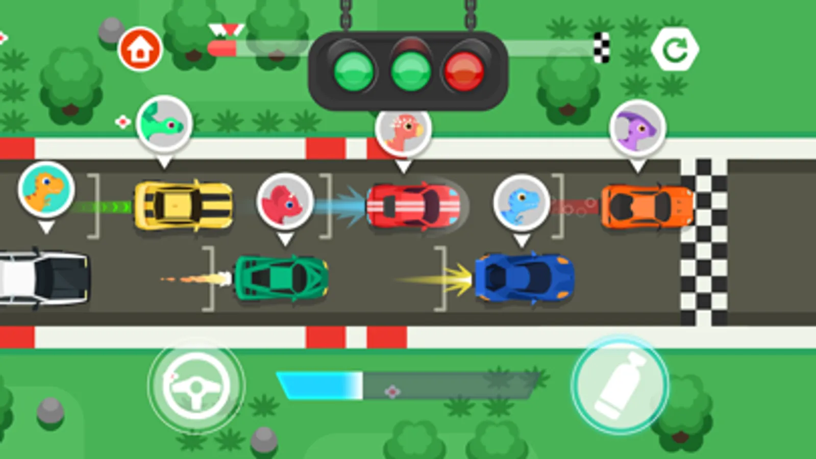 36 different vehicles, including racing cars, engineering cars, monster trucks, sports cars, classic cars and more, make for a fun and exciting time. Hop in your favorite vehicle and race with other little dinosaurs. Collect gold coins on the track, dodge roadblocks that may appear at any time, collect nitrogen to turn on super acceleration, and leap high on springs to fly over the heads of your opponents!