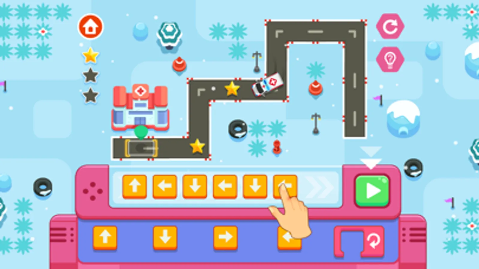Drag the blocks with arrow icons to easily control the car to move up, down, left, and right. Arrange and assemble the blocks to plan the route for the car. Learn to use the loop module instead of multiple same blocks so that coding becomes easier with fewer steps!