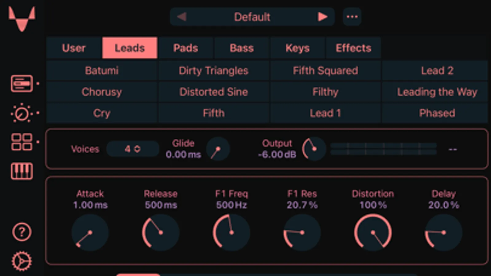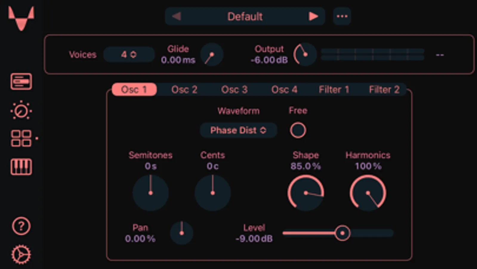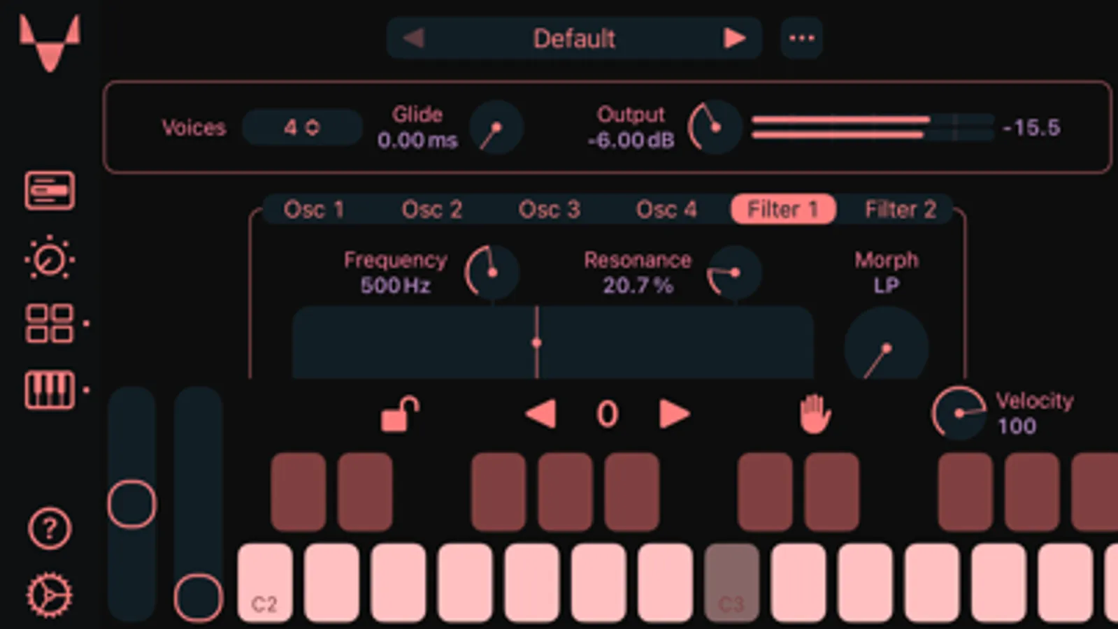 - Voice modes: monophonic, polyphonic, legato and glide