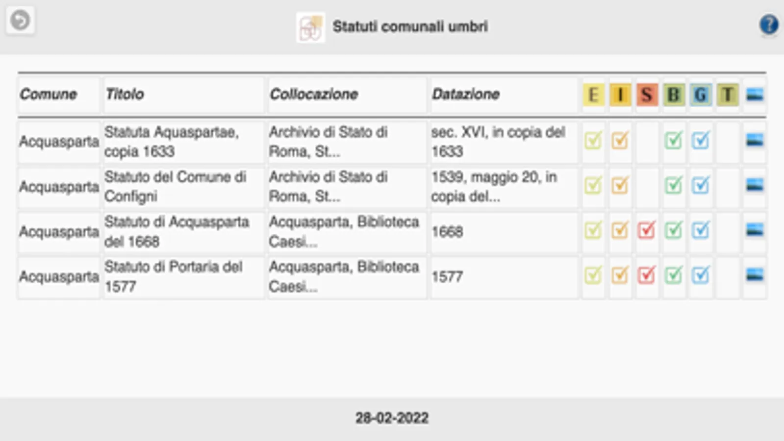 Applicazione realizzata per consentire alla Soprintendenza Archivistica e Bibliografica dell’Umbria, nell'ambito delle proprie attività istituzionali, di mettere a disposizione del pubblico i dati e le immagini degli statuti digitalizzati in oltre 20 anni di attività.