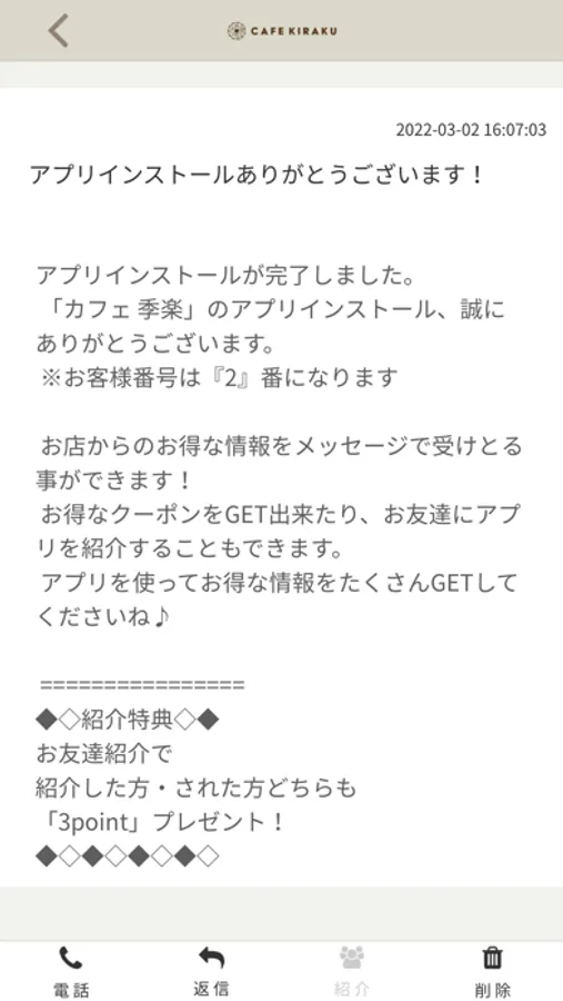 カフェ 季楽のアプリをSNSを通じてお友達に紹介する事ができます。