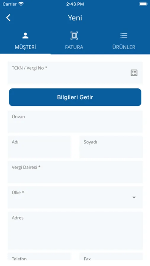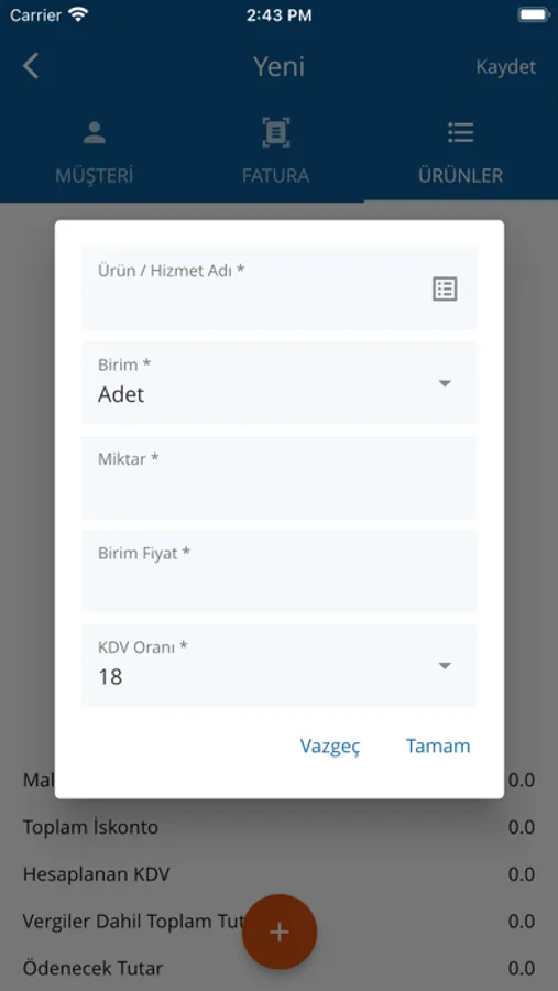 * Cari ve Stok bilgilerinizi kayıt ederek faturalarınızı hızlıca kesebilirsiniz.