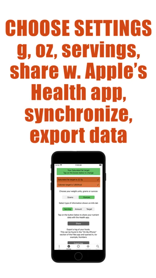 Synchronize the app (on the Settings screen) so if you have an app bundle you only need to record your food and beverage intake once and it will be shared with all apps. Record your food and beverage intake using the barcode scanner, speech recognition, by favoriting foods, or by using search function and use the serving sizes provided (mainly those suggested by USDA Food Data Central) or change to your serving size. Your progress towards your target daily intake will be visible immediately in real-time. You can also view your progress over time on the Month view dashboard, and export food diaries and saturated fat intake into a spreadsheet for your own information or to share with healthcare providers.