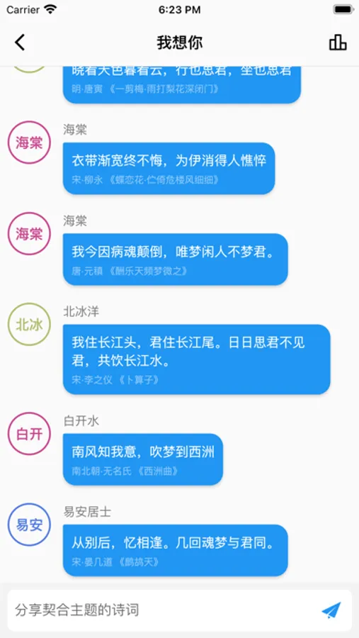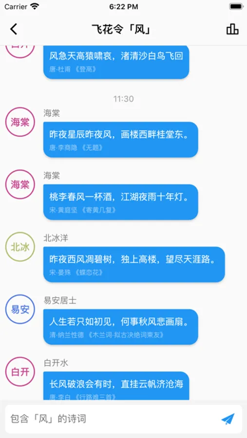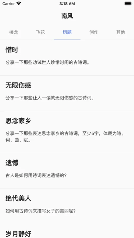 南风-诗词接龙是一款兼具娱乐和学习古诗词的产品,该产品使用聊天的形式,用中华传统文化中的成语,古诗词,来玩接龙的游戏,还有诗词飞花令的功能,更有主题诗词分享的功能,该功能可以让我们学习古人是如何用诗词表达自己的情感的。