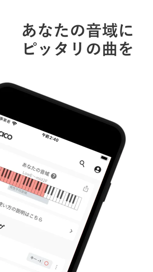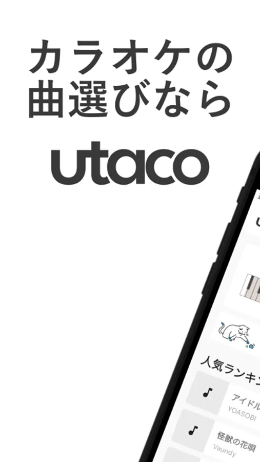 utacoはカラオケの曲選びを手助けするサービスです。 音域が狭くても歌える曲をおすすめしたり、歌いやすいキー調整をおすすめしたり、カラオケにおける悩みを解決していきます。