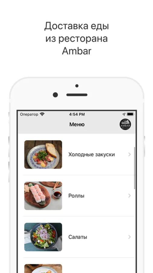 Как сделать заказ в приложении “Ambar”: выберите понравившиеся позиции из меню, добавьте их в корзину и перейдите на экран оформления заказа (по нажатию на иконку корзины).