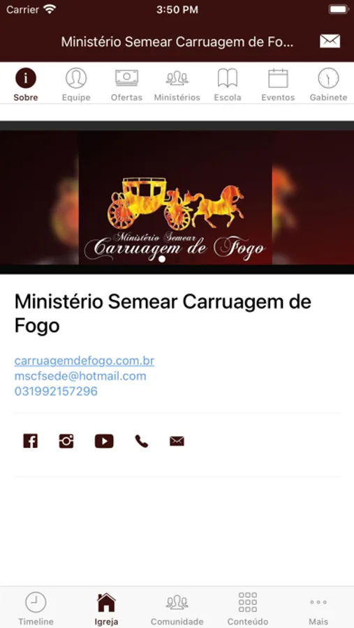 - Informações da Igreja (endereço, telefone, site, redes sociais, pastores)
