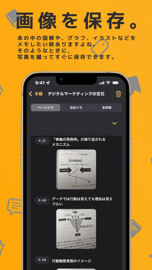 - 画像もメモすることができます。本の中の図解やグラフ、イラストなどを写真撮ってメモできます。