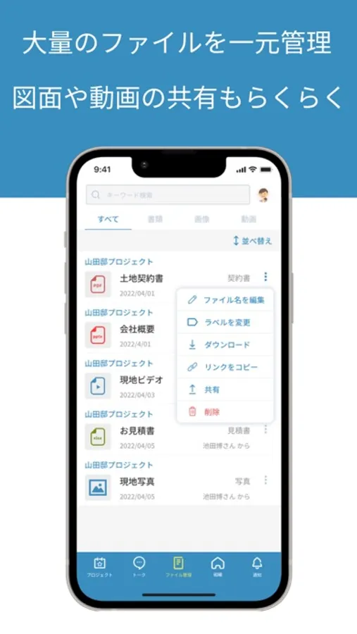 最新図面や契約書などさまざまなデータを長期で保管可能。また、様々な拡張子に対応しているためアプリ内でファイルの一元管理ができます。