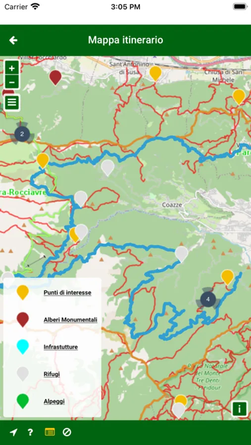 Naviga sulla Mappa scegliendone lo sfondo che preferisci ed esplora punti d’interesse storico – culturale (architetture militari, avvenimenti storici, beni religiosi, siti di cultura materiale, edifici storici, fontane monumentali, meridiane), alberi monumentali, infrastrutture (aree attrezzate, parcheggi, punti acqua), rifugi, alpeggi.