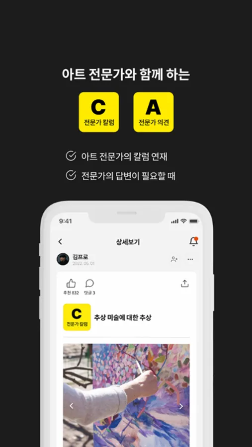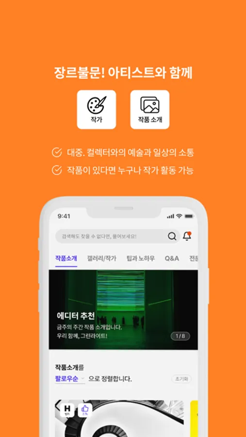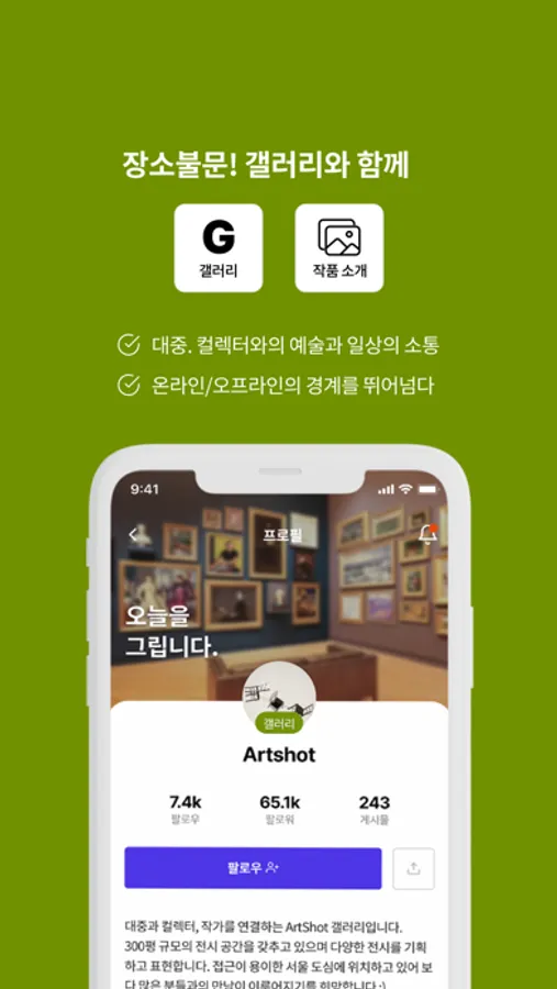 작가의 작품은 물론, 전시 정보, 일상 공유를 통해 한층 더 가까워지는 아트를 경험해보세요.