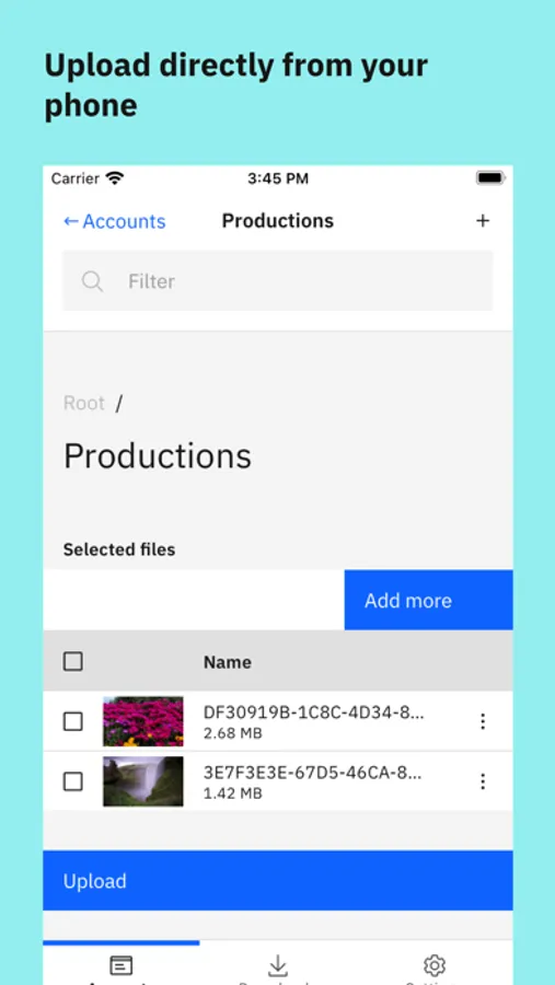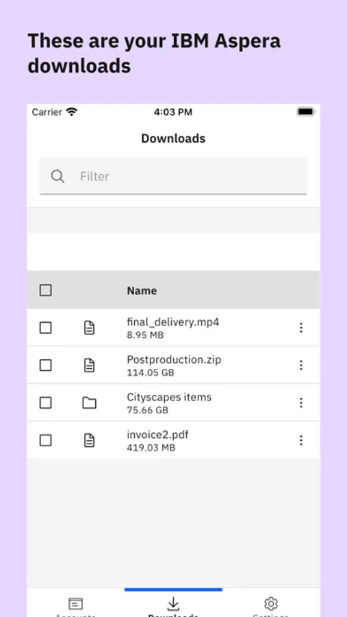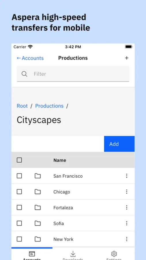 Enjoy streamlined functionality for fast FASP file transfers to and from your IBM Aspera server by linking to your server account in the mobile app.