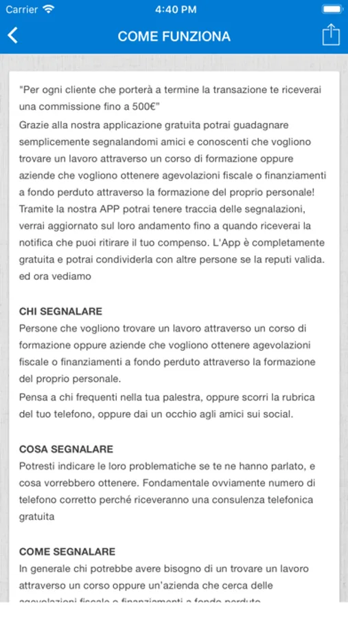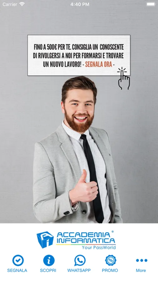 Con Accademia Informatica il passaparola viene premiato! Grazie alla nostra applicazione gratuita potrai guadagnare semplicemente segnalandomi amici e conoscenti che vogliono trovare un lavoro attraverso un corso di formazione oppure aziende che vogliono ottenere agevolazioni fiscali o finanziamenti a fondo perduto attraverso la formazione del proprio personale! Tramite la nostra APP potrai tenere traccia delle segnalazioni, verrai aggiornato sul loro andamento fino a quando riceverai la notifica che puoi ritirare il tuo compenso. L'App è completamente gratuita e potrai condividerla con altre persone se la reputi valida. Ci fa molto piacere di vederti nella nostra rete di segnalatori per lavorare assieme e guadagnare assieme. Accademia Informatica è un ente di formazione e un'agenzia per i servizi a lavoro accreditata alla Regione Lazio, con sede a Roma, promuovere la formazione professionale, la riqualificazione e l’aggiornamento del personale, l’avviamento al lavoro, attraverso di corsi di formazione finanziati da enti pubblici e/o privati. Organizza corsi, attività di formazione professionale, coinvolgendo sempre di più il sistema d’impresa, liberi professionisti e ragazzi, stimolando ad utilizzare le risorse Comunitarie, Statali, Regionali e di qualsiasi ente locale. Il nostro obiettivo è quello di conferire valore aggiunto alle imprese, implementando le competenze del loro organico e affiancandole nella trasmissione delle conoscenze, per accrescerne la professionalità e la competitività principalmente sul mercato del ICT. I nostri servizi a lavoro assistono le persone per tutto l'iter di accompagnamento a lavoro permettendo alle persone di incontrare diverse aziende al fine di trovare quella corrispondente alle proprie competenze.