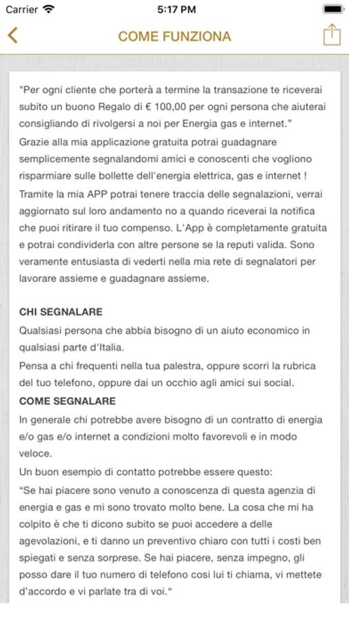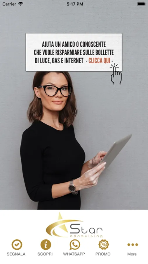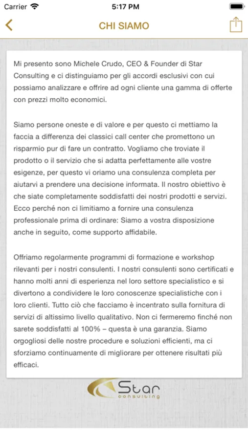 Può una semplice segnalazione farti guadagnare soldi? Grazie alla mia applicazione gratuita potrai guadagnare semplicemente segnalandomi amici e conoscenti che vogliono risparmiare sulle bollette dell'energia elettrica, gas e internet! Tramite la mia APP potrai tenere traccia delle segnalazioni, verrai aggiornato sul loro andamento fino a quando riceverai la notifica che puoi ritirare il tuo compenso. L'App è completamente gratuita e potrai condividerla con altre persone se la reputi valida. Sono veramente entusiasta di vederti nella mia rete di segnalatori per lavorare assieme e guadagnare assieme. Mi presento sono Michele Crudo, CEO & Founder di Star Consulting e ci distinguiamo per gli accordi esclusivi con cui possiamo analizzare e offrire ad ogni cliente una gamma di offerte con prezzi molto economici. Siamo persone oneste e di valore e per questo ci mettiamo la faccia a differenza dei classici call center che promettono un risparmio pur di fare un contratto. Vogliamo che troviate il prodotto o il servizio che si adatta perfettamente alle vostre esigenze, per questo vi offriamo una consulenza completa per aiutarvi a prendere una decisione informata. Il nostro obiettivo è che siate completamente soddisfatti dei nostri prodotti e servizi. Ecco perché non ci limitiamo a fornire una consulenza professionale prima di ordinare: Siamo a vostra disposizione anche in seguito, come supporto affidabile. Offriamo regolarmente programmi di formazione e workshop rilevanti per i nostri consulenti. I nostri consulenti sono certificati e hanno molti anni di esperienza nel loro settore specialistico e si divertono a condividere le loro conoscenze specialistiche con i loro clienti. Tutto ciò che facciamo è incentrato sulla fornitura di servizi di altissimo livello qualitativo. Non ci fermeremo finché non sarete soddisfatti al 100% – questa è una garanzia. Siamo orgogliosi delle nostre procedure e soluzioni efficienti, ma ci sforziamo continuamente di migliorare per ottenere risultati più efficaci.