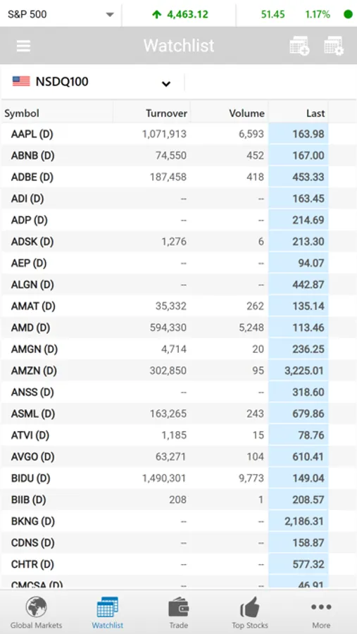 • Detailed quote for symbols, giving you a snapshot of a symbol's performance