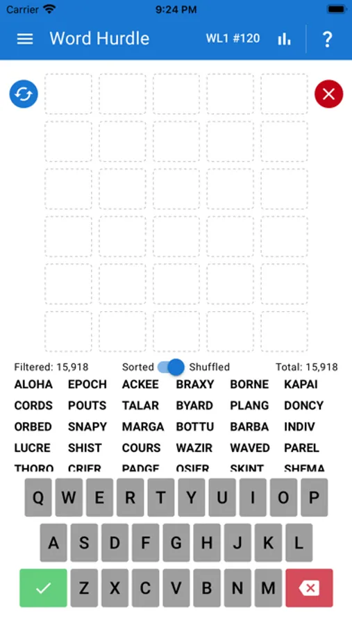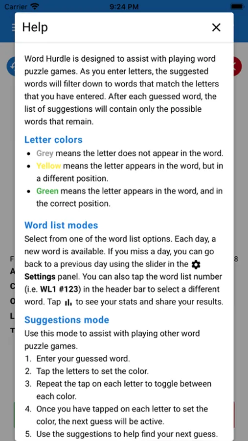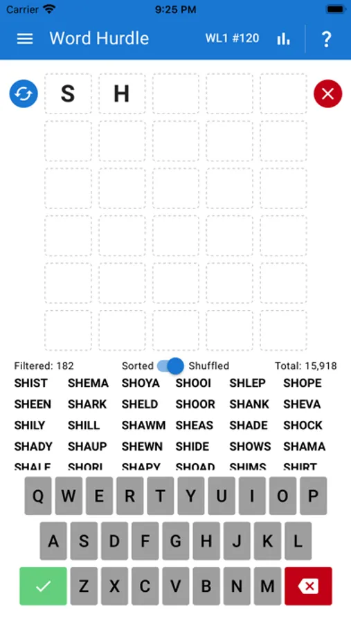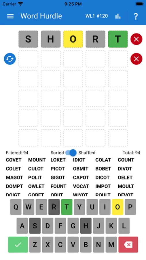 As you type letters, the list of suggested words will filter down to words that match the letters that you have entered. Word Hurdle will suggest the possible words remaining, based on the guesses you have made so far.