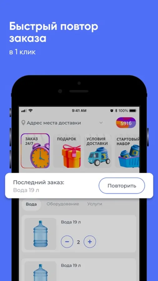 Скачайте приложение Водонос на свой смартфон и делайте заказ воды 24/7. Вы сможете повторять заказ нажатием одной кнопки, видеть всю историю покупок и быть в курсе всех акций компании.