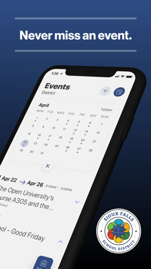 The event section shows a list of events throughout the district. Users can add an event to their calendar to share the event with friends and family with one tap.