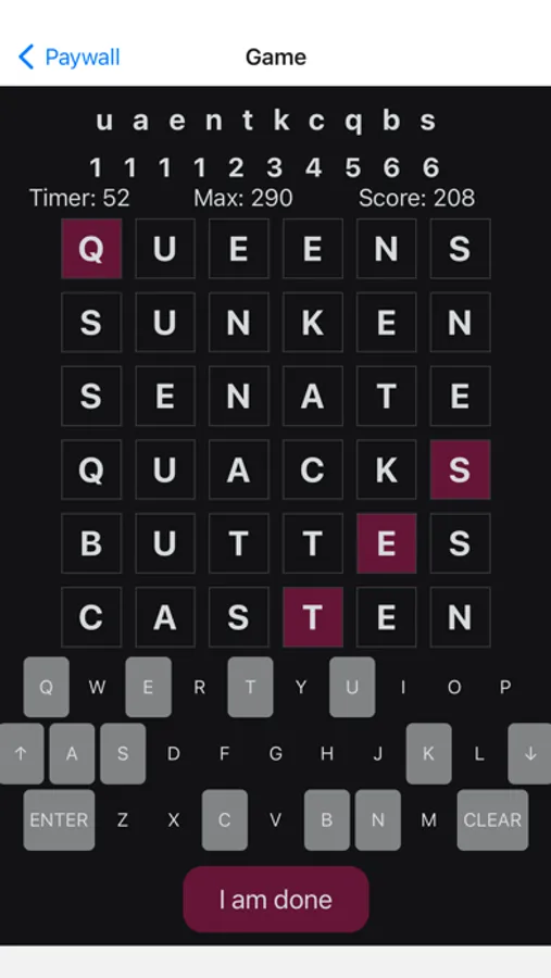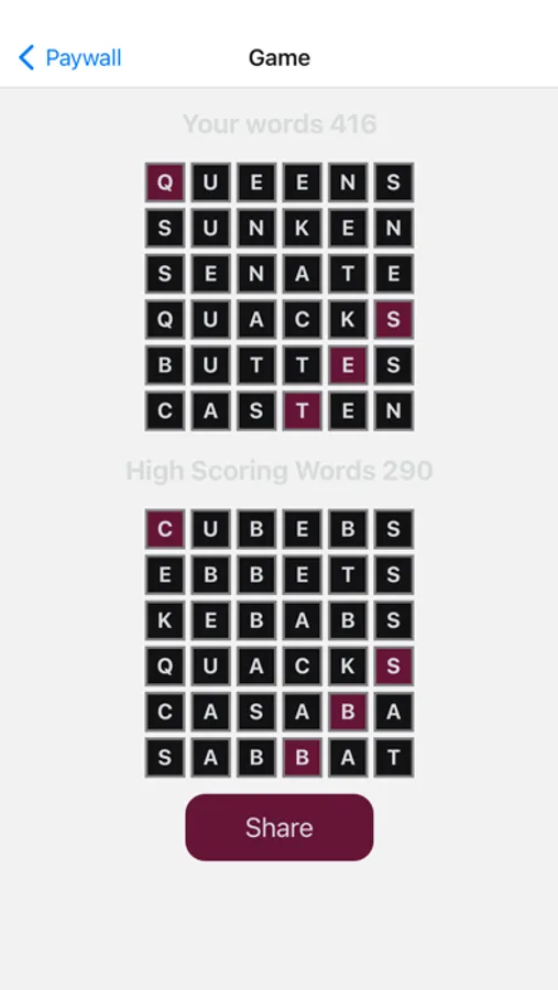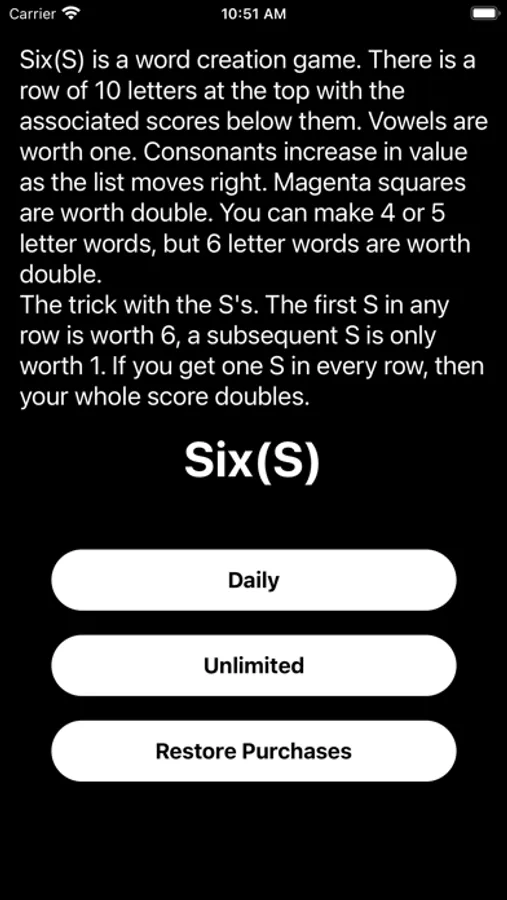 A word game where you make six, six letter words from a selection of 10 letters, trying to beat the max score. It has a daily round that everyone plays, and a practice mode, where you can play again and again.
