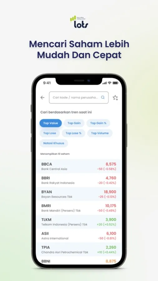 Pencarian saham menjadi lebih mudah dengan adanya filter top value, gain, lose, dan volume berdasarkan persentase ataupun dari nilai saham membuat Anda lebih cermat dalam memilih dan memilah investasi