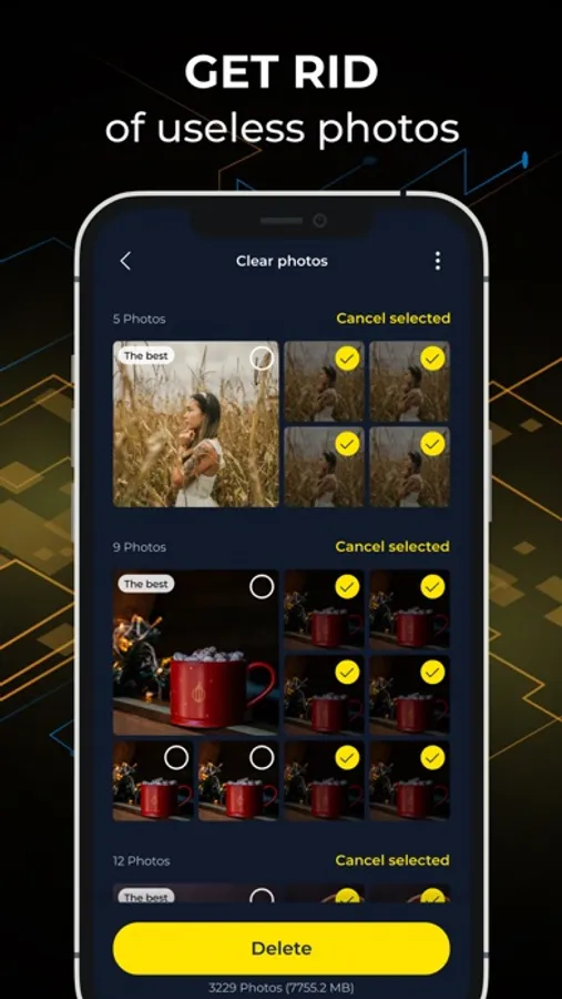 This app will find similar photos and videos and combine them. All you have to do is choose the best of them, just what you want to keep.