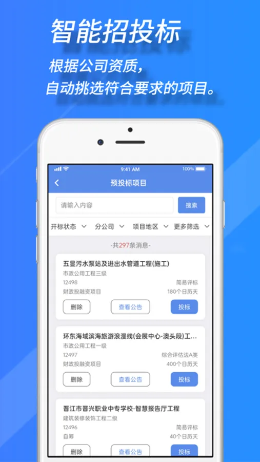 根据建筑企业自身资质,地区,金额等筛选项目信息推送
