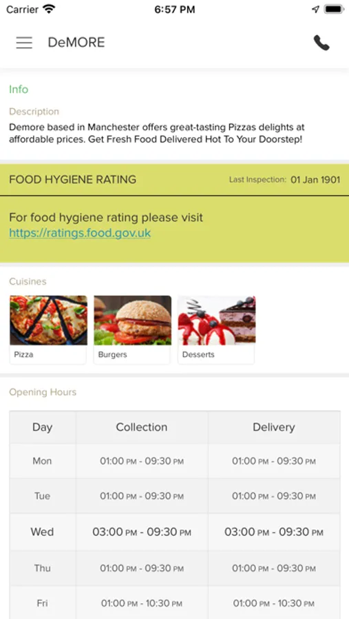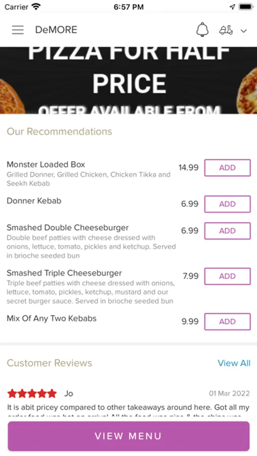 Order food online from DeMORE! It's so easy to use fast and convenient. Try our new online app which contains our entire takeaway menu. We’re passionate about providing delicious and high-quality food, our priority is to satisfy all of our customer's needs - we offer a variety of excellent food, prepared with the freshest and finest ingredients, to the highest standard.