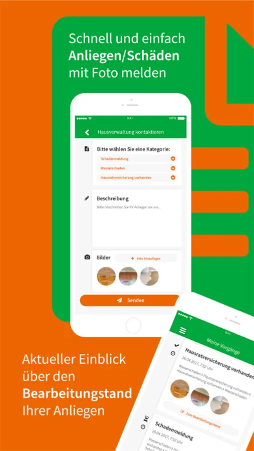Als Mieter oder Eigentümer können Sie Schäden oder Anliegen direkt mit Fotos über unsere App melden. Ihre Anfragen stehen unseren Mitarbeiten dann zur Verfügung und können auch an Handwerksbetriebe weitergeleitet werden.