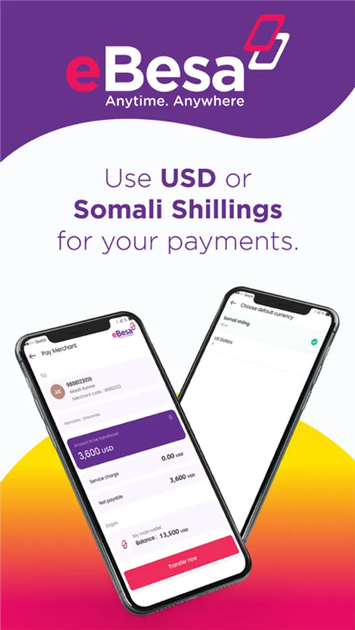 6. Multicurrency-eBesa Comes in both USD and Somali Shillings allowing Somali People to take pride in transacting in own currency. This is support by currency conversion module.