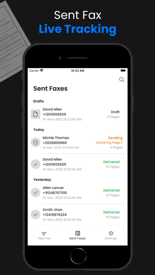 - Sent Fax list with fax delivery status and details.