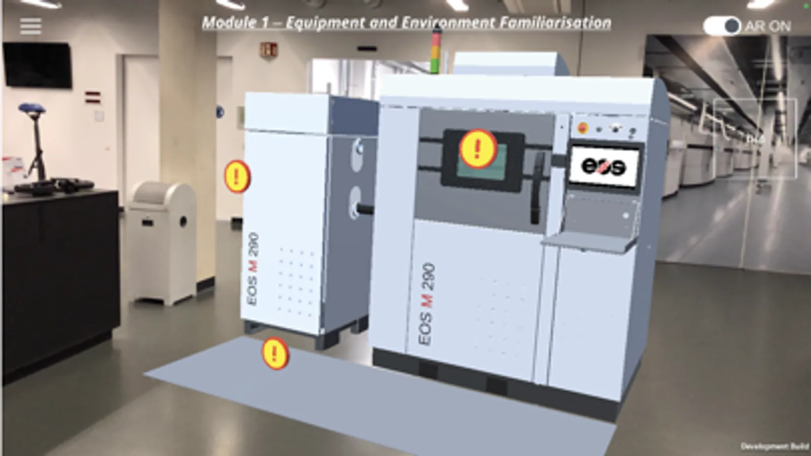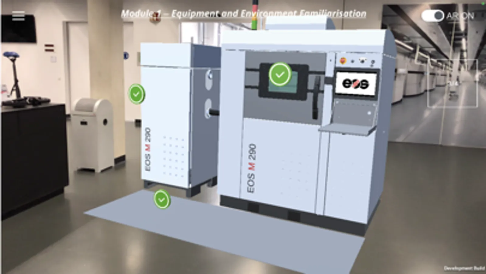 Module 1 takes you through an xR based machine familiarization where you will learn about the different components, features and functions of the EOS M 290 system. With the AR mode on, you will be able to physically navigate and explore a real-size virtual model of the system with visual cues, that will indicate the key regions of interest.