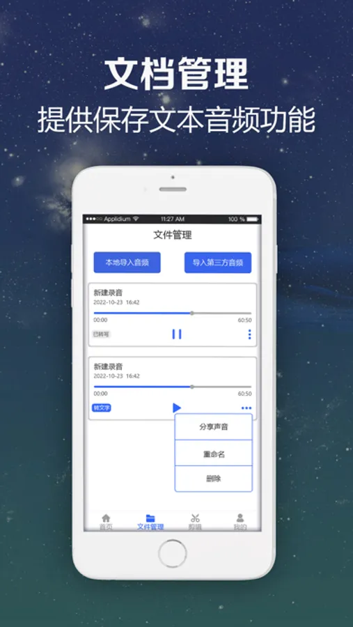 手机音频一键智能导入,转换的文字文本支持分享、复制等方便快捷操作;