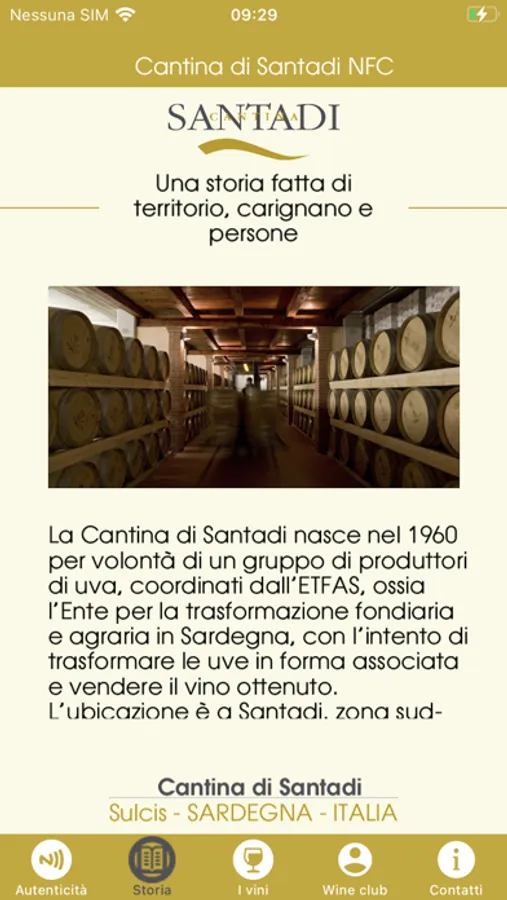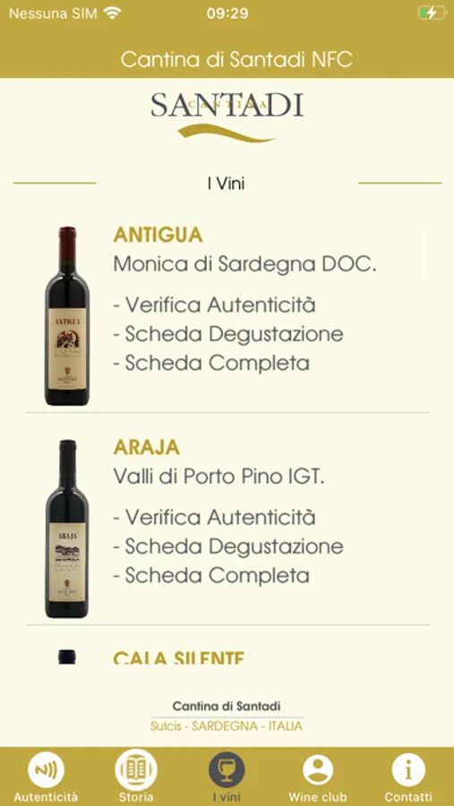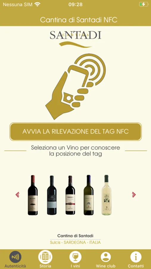 La app Santadi NFC ti consente di verificare l'autenticità dei vini prodotti da Santadi SPA. Il TAG Autentico è posizionato al di sotto della retro etichetta o sotto forma di bollino ben visibile nella bottiglia.