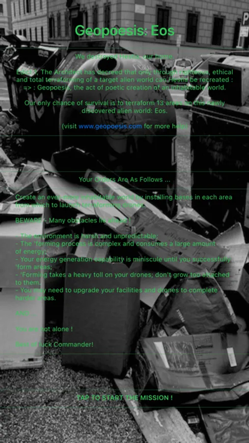 We destroyed Hestia, our home, our Earth. You have been charged to execute geopoesis on one of the scarce number of promising, but hostile, alien worlds, Eos. Our only chance of survival is for you to terraform the 13 very challenging areas on this hostile planet.